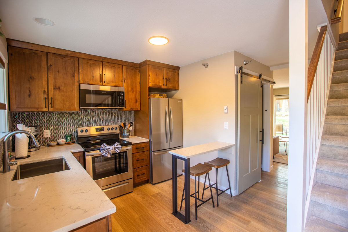 Unwind to the sights and sounds of the river as you enjoy morning coffee on the streamside patio. Skip the hassle of parking and take an pleasant 5 minute stroll along the popular Riverwalk path into town to enjoy shopping or dining. These charming 2 bedroom, 1.5 bathroom, 2 level condos have been fully remodeled in a tasteful, mountain-modern style and promise an unforgettable vacation couples, friends, families, or large groups seeking relaxation and adventure amidst breathtaking mountain scenery.