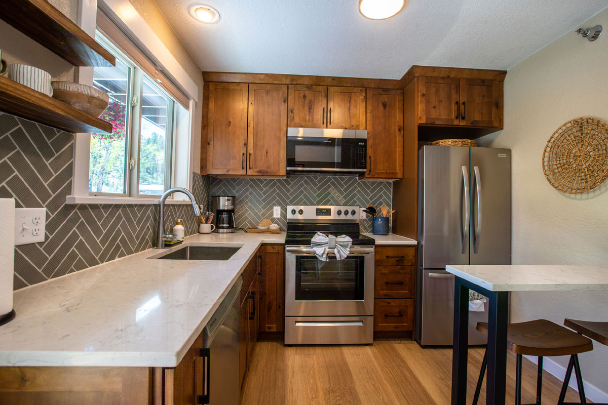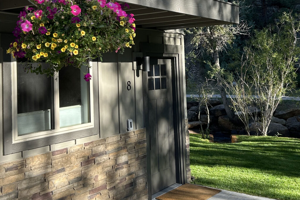 All 8 units have the same floorplan and amenities. Each one has a delightful back patio on Fall River, a front balcony also on the river and all have access to a common sitting area w/BBQ and chairs, and a hammock! Unit 1 and 2 are pet friendly. Unit 5 has the best view from the big bedroom and unit 8 is the premium end unit right on the “riverpointe”. Book individually or in multiples for large groups.